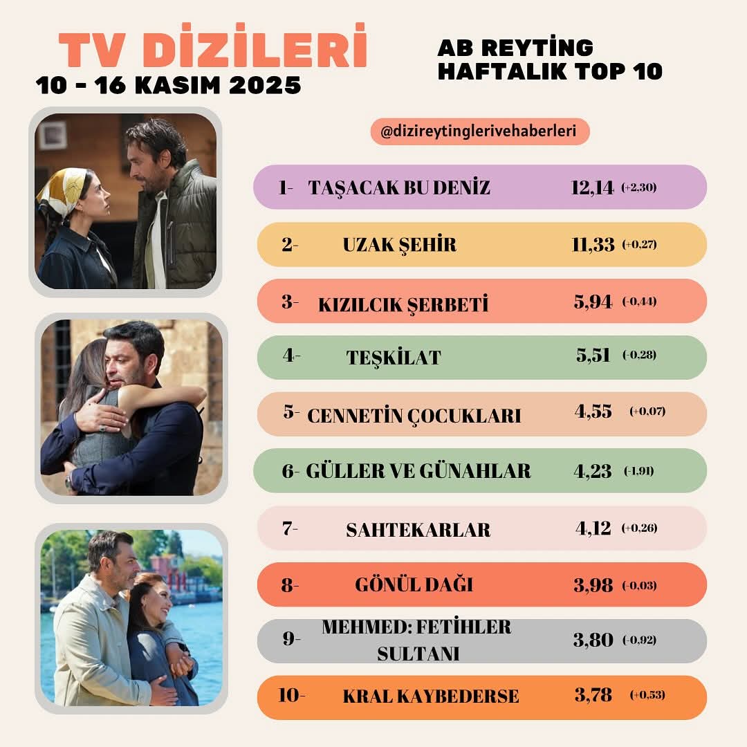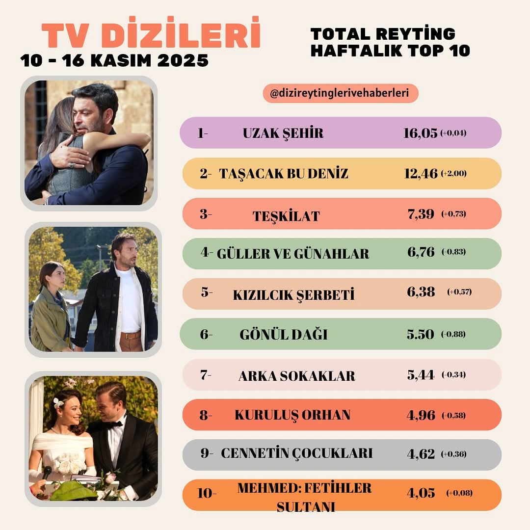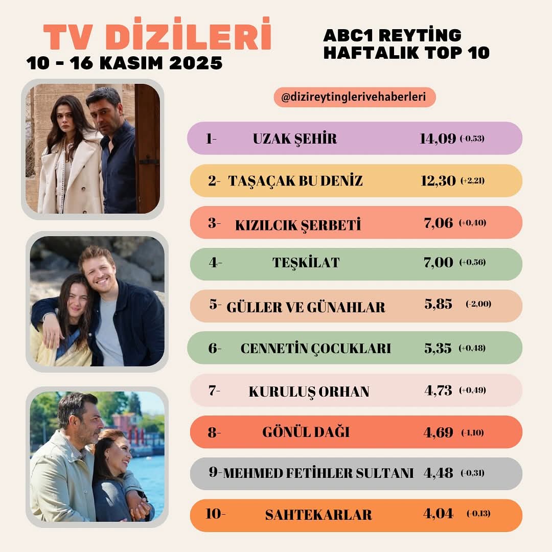The new weekly Total Ratings for Turkish television have been released for the period November 10–16, 2025, revealing the most-watched drama series across the country. This week brought several surprising jumps, strong performances from long-running productions, and a new wave of competition among top-rated shows.