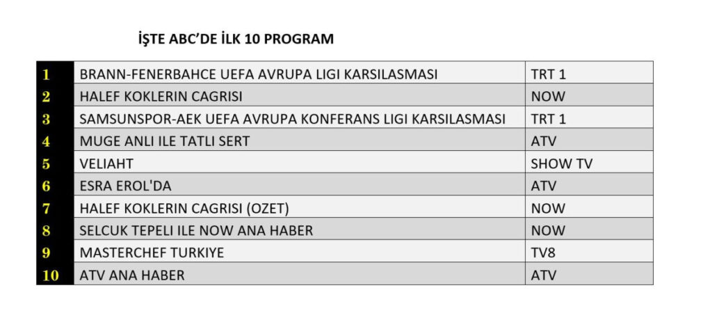 Second place went to the Brann–Fenerbahçe UEFA Europa League match, while “Esra Erol’da” finished the night in third.