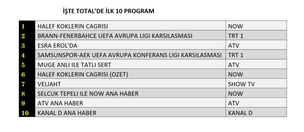 In the Total group, NOW TV’s rising hit “Halef: Köklerin Çağrısı” secured first place, continuing its impressive momentum and audience grip.