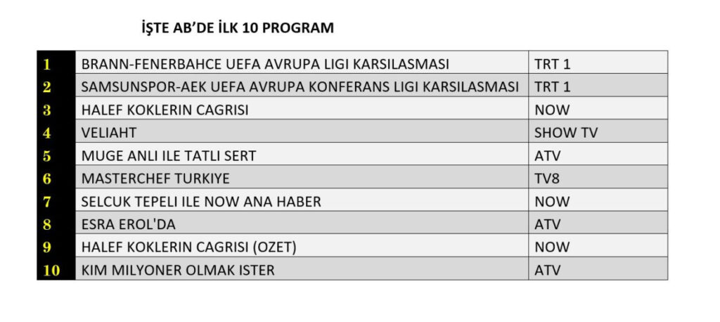 Second place went to the Brann–Fenerbahçe UEFA Europa League match, while “Esra Erol’da” finished the night in third.